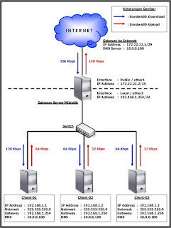 Dalam artikel ini akan coba dijelaskan mengenai bagaimana mensetting MikroTik sebagai gateway dan bandwidth management dalam sebuah LAN. Sebelum masuk ke proses konfigurasi, agar lebih mudah dipahami berikut saya gambarkan topologi jaringan sebagai contoh kasus yang kemudian akan kita implementasikan dalam bentuk konfigurasi MikroTik. Ini sebagai contoh saja, aslinya anda harus menyesuaikan dengan kondisi jaringan anda sendiri.